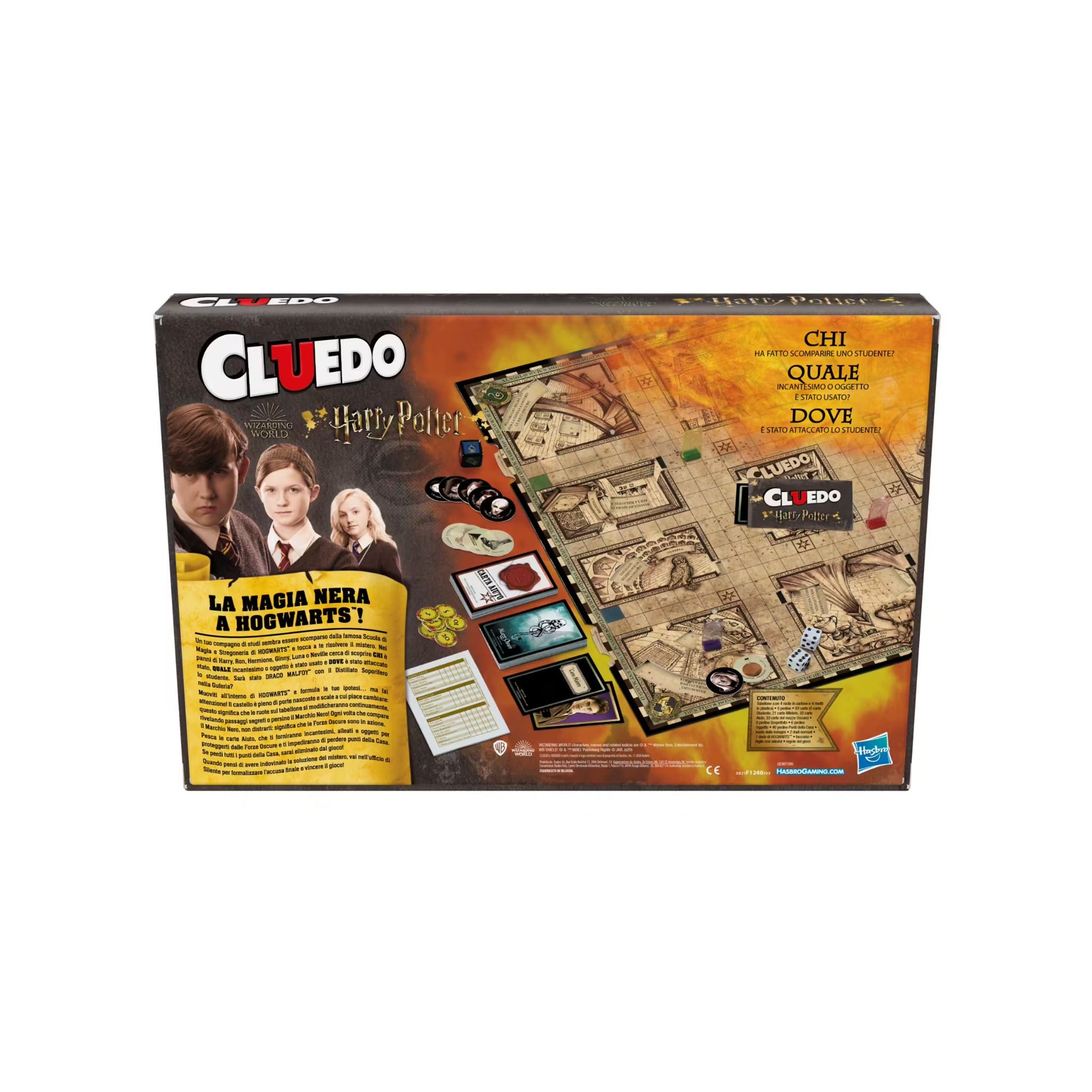 - Chi, cosa, dove: bambini e bambine si spostano lungo il tabellone nei panni di Harry, Ron, Hermione, Ginny, Luna o Neville e provano a scoprire chi è sparito, quale incantesimo è stato usato e dove è avvenuto il crimine